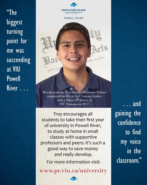 Brooks graduate Troy Barnes (Klahoose Nation) completed his BA in first nations Studies, with a minor in History, at VIU Nanaimo.